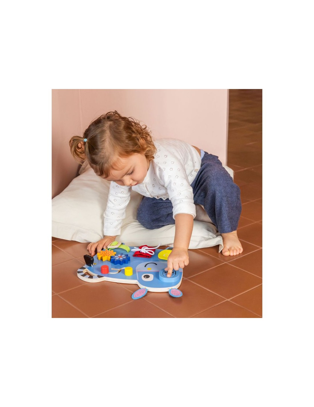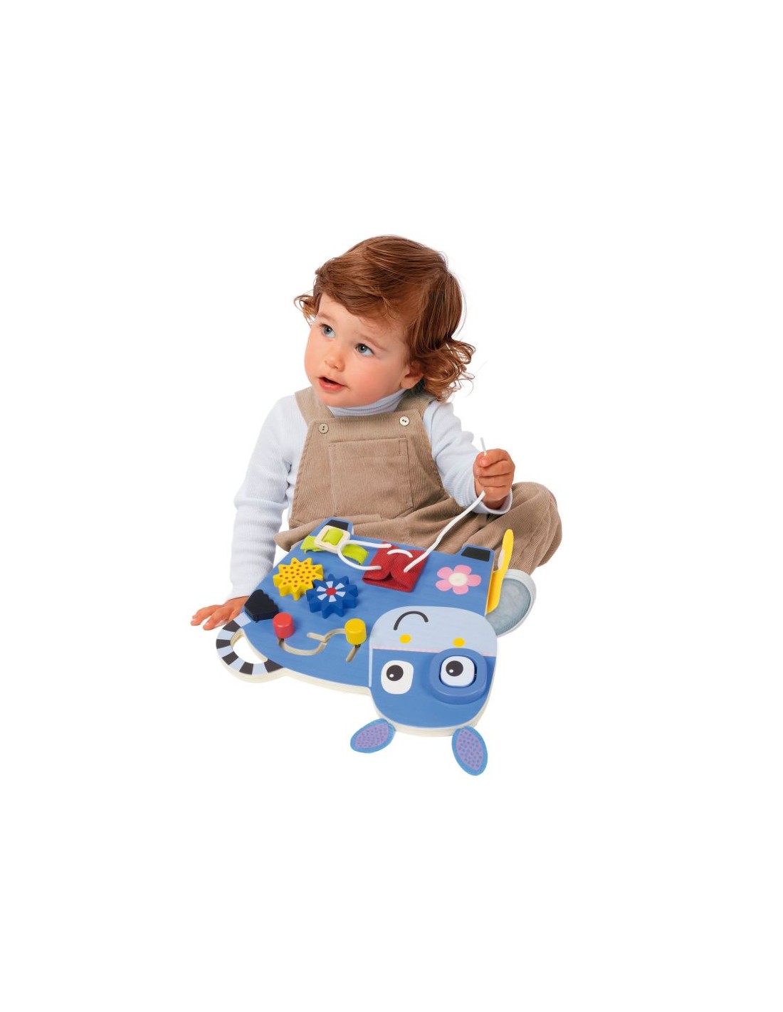 - Permite a los más pequeños explorar y manipular con diferentes actividades: abroches, engranajes, pasadores, etc.