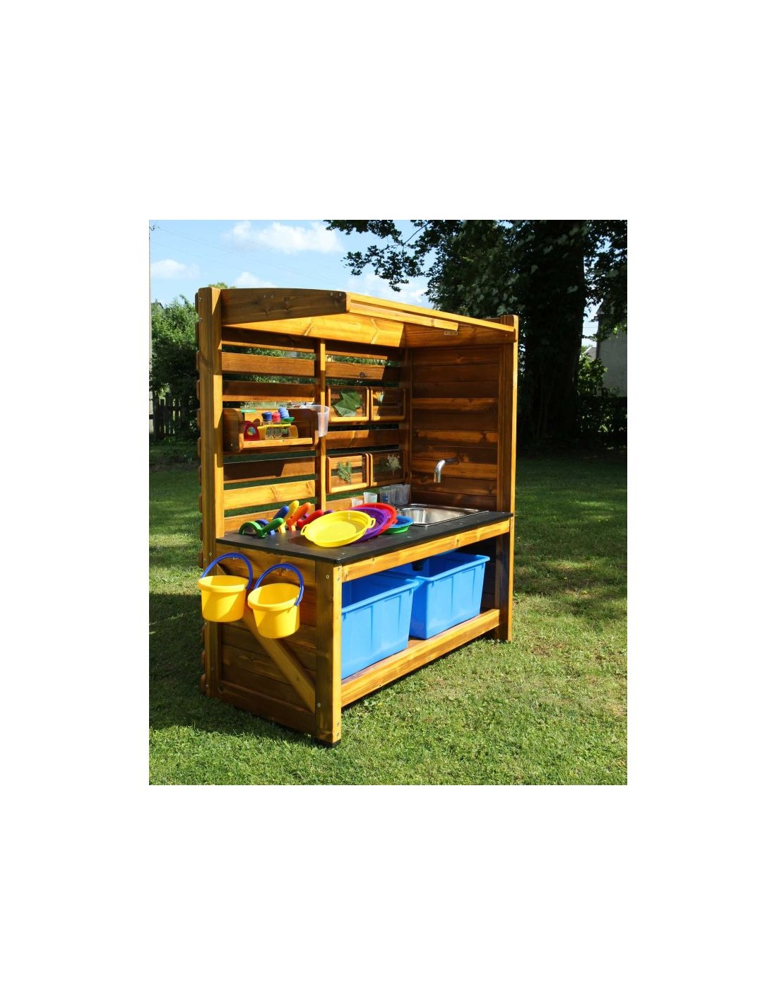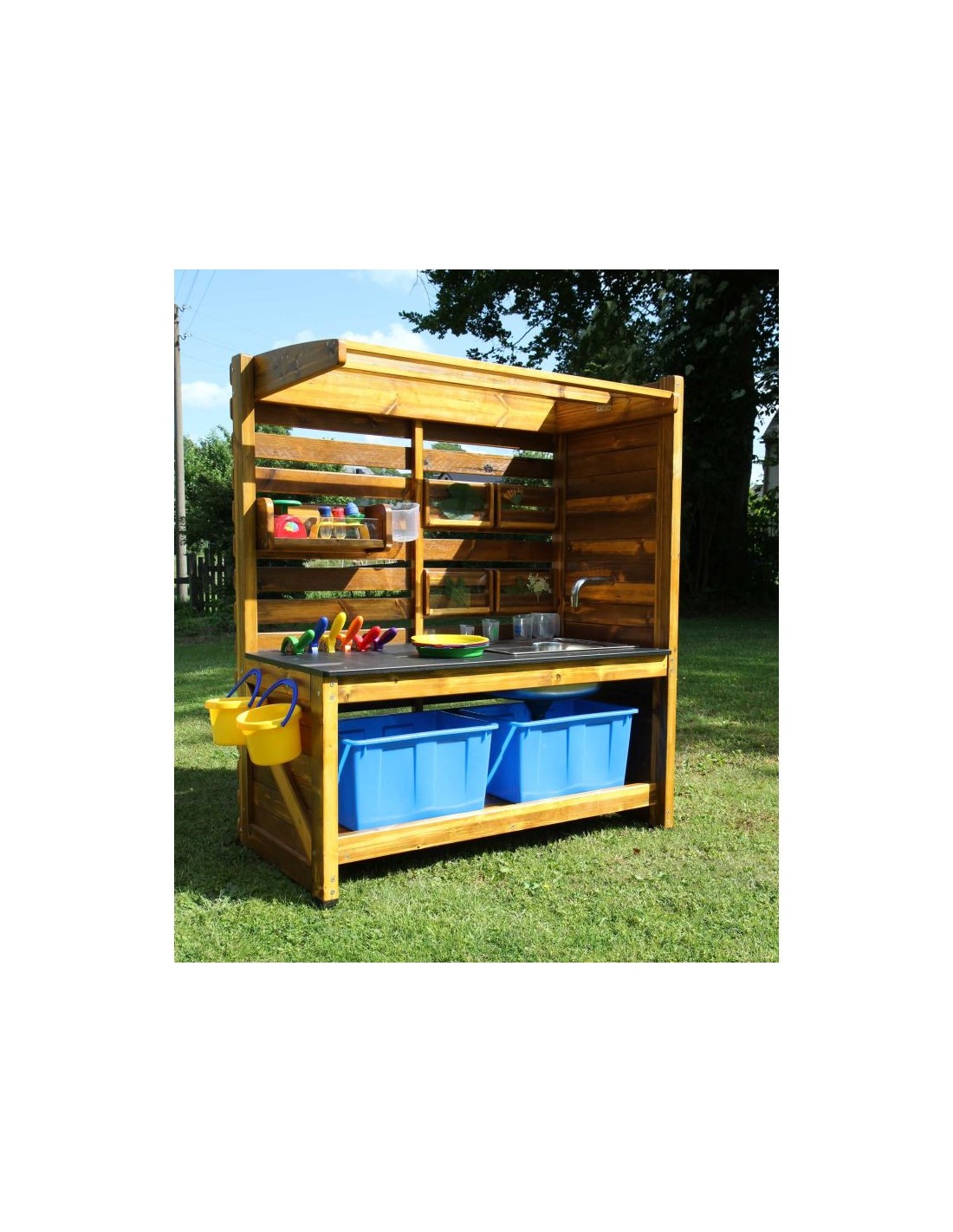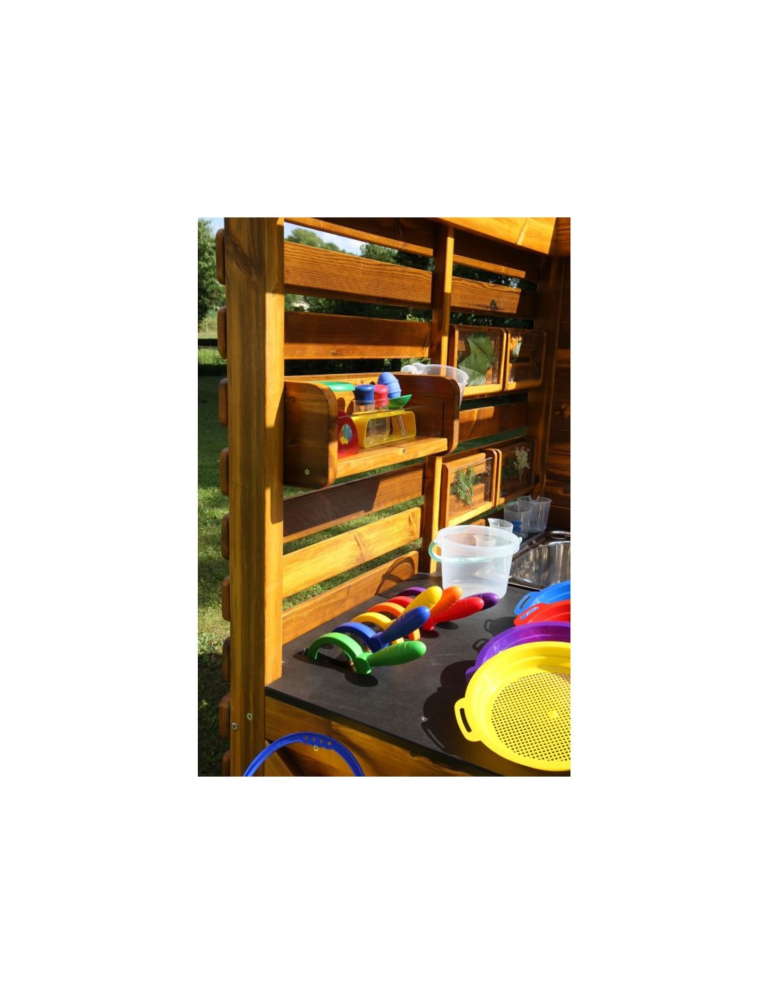 - Incluye: grifo de agua con bomba de agua, 3 vasos medidores realizados en plástico, 16 fichas con objetos de la naturaleza, set de 6 lupas, cajas transparentes para rellenar con hojas y cualquier elemento, 3 cubos, balanza con vaso de medición, pipetas, tubos de ensayo y 5 tamices.