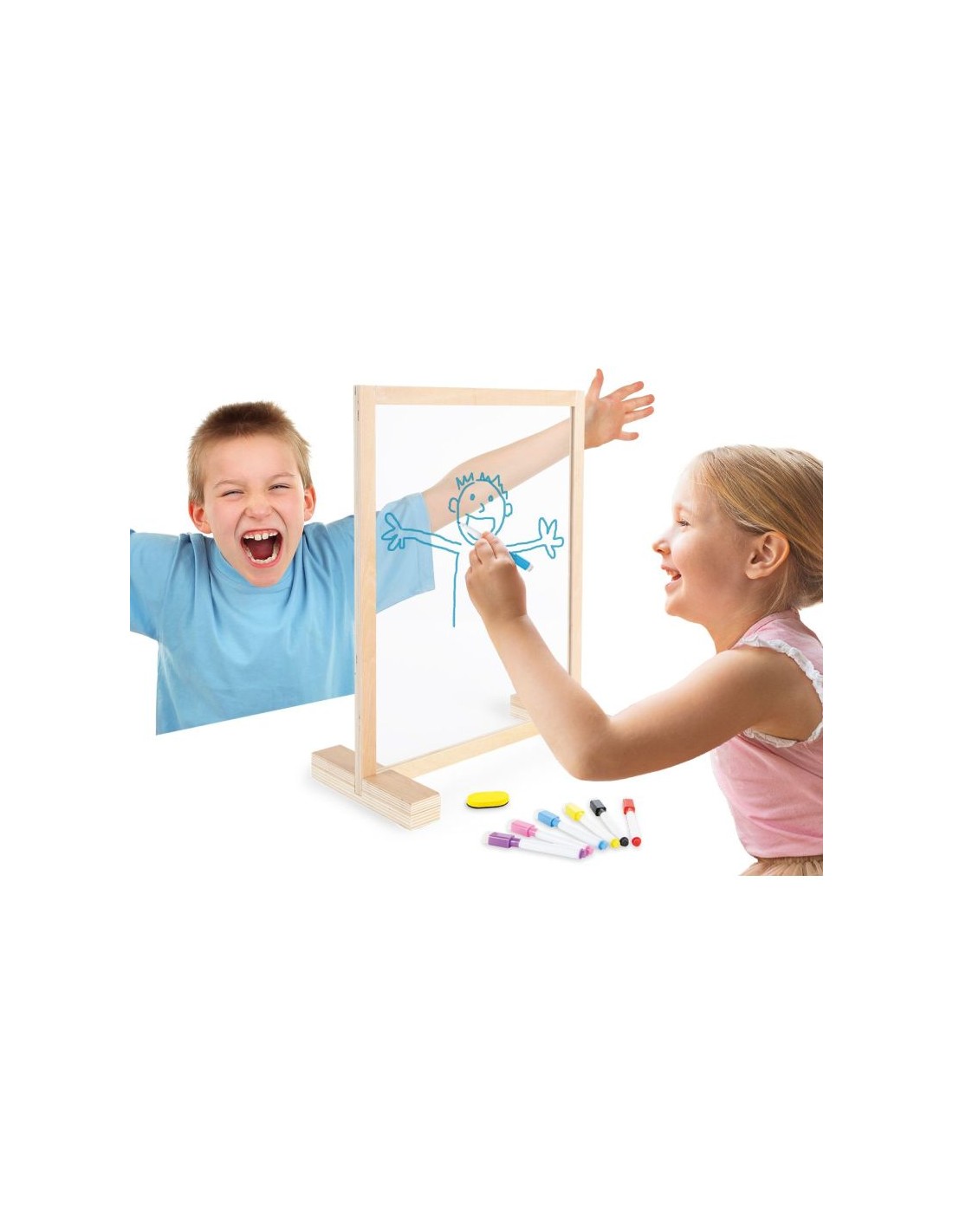 Pizarra transparente con marco de madera ecológico, 2 bases de madera, 6 rotuladores de colores borrables en seco y 1 borrador.