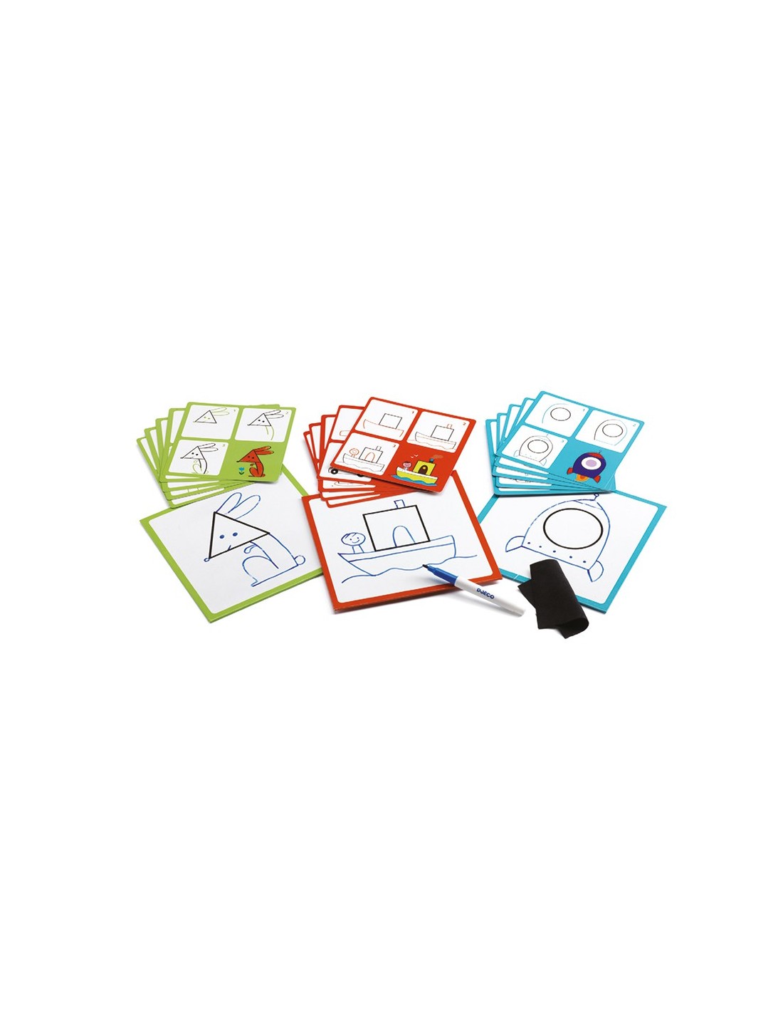 Gracias la pizarra borrable podrás practicar tantas veces como quieras, siguiendo los 3 pasos de cada ficha, empezando por la silueta y finalizándolos con los últimos detalles.