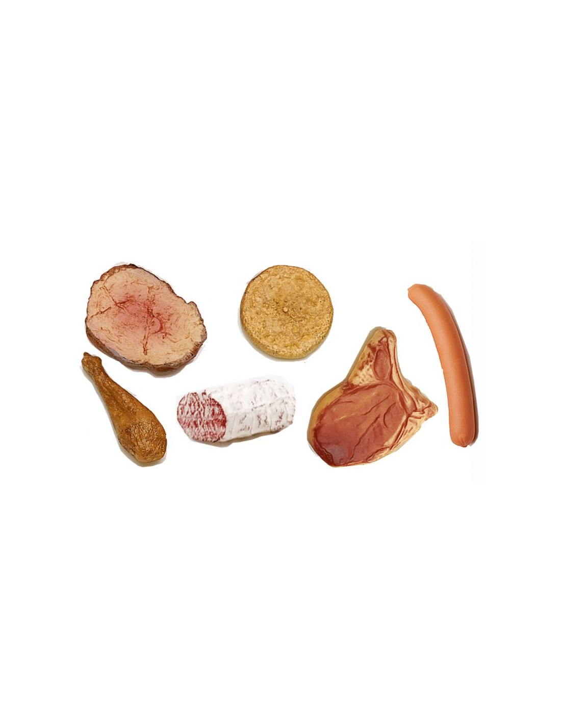 En plástico a tamaño natural. Consta de: chorizo, chuleta, muslo de pollo, salchicha, etc. 6 piezas. En bolsa.