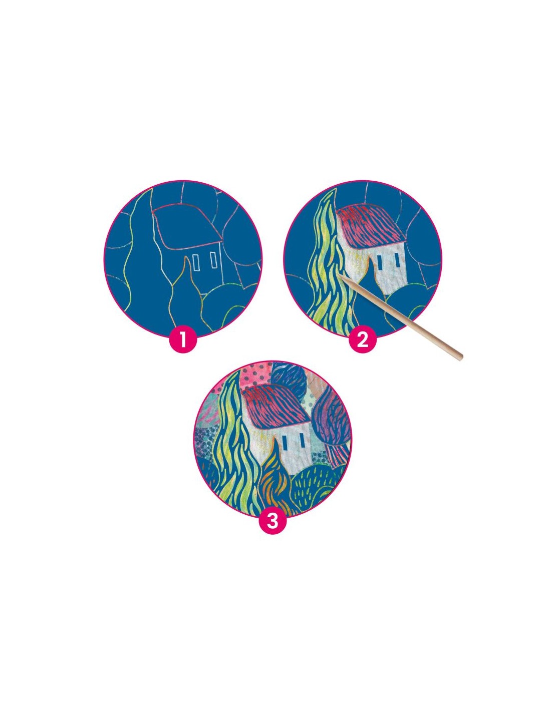 Contenido: 4 tarjetas para rascar, 1 punzón de madera de punta doble y manual de instrucciones.