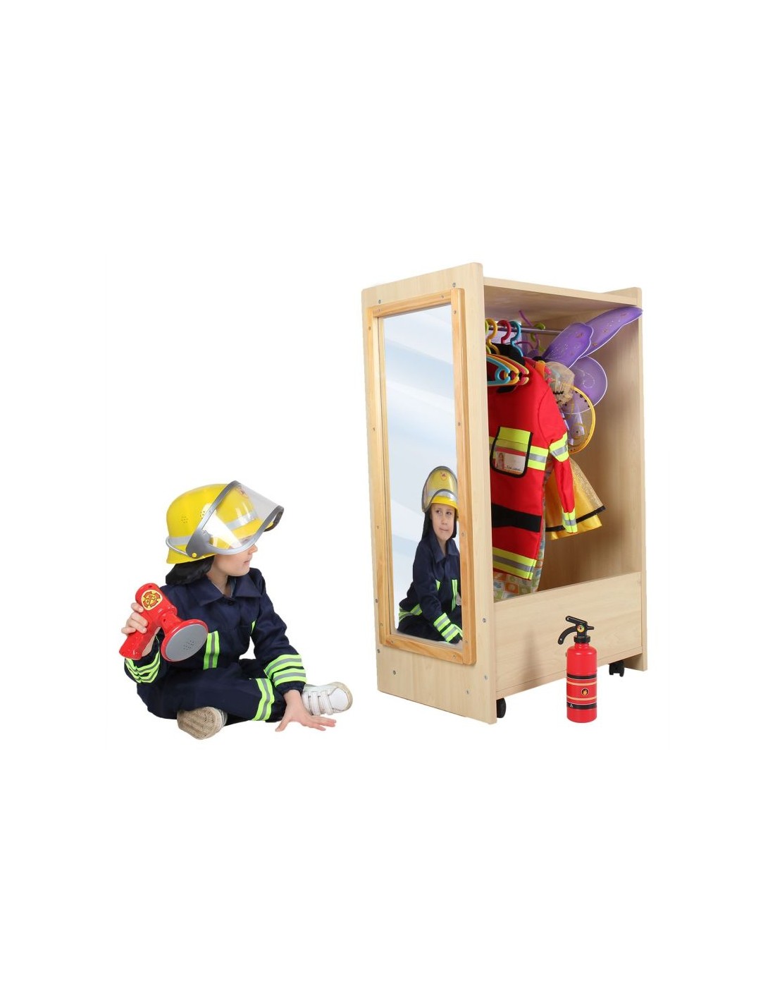 Para guardar los disfraces de los más pequeños. Incluye un espejo y barra metálica para colgar las prendas, estante superior de almacenaje. Con ruedas giratorias con bloqueo para facilitar el transporte. Realizado en madera de gran calidad.