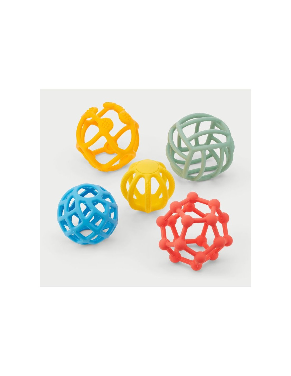 - 5 pelotas tipo jaula con diferentes formas y tamaños de agujeros.
