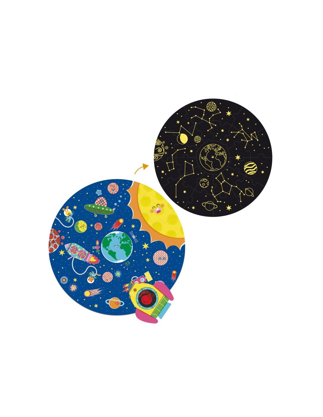 - Reversible con dos escenas: de día con los planetas y el sol. Por el otro lado, la noche con las constelaciones.